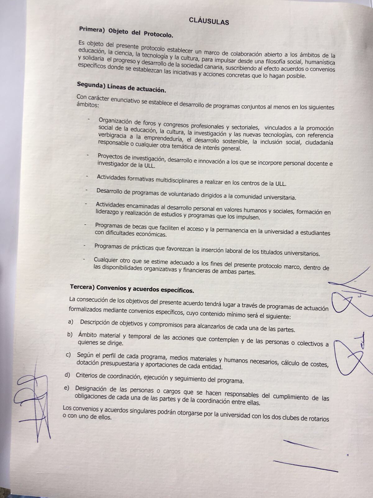 En presencia del Gobernador del Distrito, Don Manuel Florián, se firmo este jueves 15 de marzo un protocolo de actuaciones entre la Universidad y los Clubes Rotarios de Tenerife Sur y La Laguna.