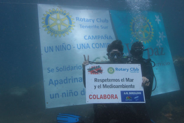 La institución Rotary Club Tenerife Sur, plenamente involucrada en la campaña solidaria de atención a los más desfavorecidos, se encuentra inmersa en la elaboración de un futuro vídeo titulado «Tierra – Mar – Aire», a través del cual, aparte de buscar una propuesta original de captación de fondos para sus fines benéficos, pretende servir de experiencia interesante y provechosa que potencie el desarrollo turístico y económico del sur isleño. En las últimas semanas se han venido efectuando las pruebas generales de esa videograbación en su vertiente subacuática, actividad en la que han tomado parte un equipo considerable de instructores, fotógrafos, personal de seguridad, miembros rotarios así como las ganadoras del curso de buceo (ofrecido gentilmente por TravelSub) sorteado entre los propios colaboradores de Rotary Club y la participación de un alumno del Colegio Costa Adeje (que celebró de esta manera el formidable ejemplo de solidaridad de ese centro educativo con la reciente recolecta). A través de las imágenes captadas por las cámaras submarinas no solo se hace hincapié, de una forma absolutamente original y atractiva, en la publicidad de eventos, instituciones y acontecimientos benéficos sino que el espectador se lleva una impresión sugerente de los fondos marinos del sur de Tenerife que pueden captar el interés y la atención de posibles futuros visitantes de dichos ecosistemas únicos.